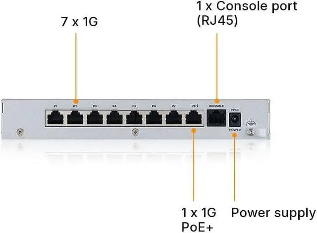 FLEXIBLE SOFTWARE-DEFINED PORTS: 8 x 1G RJ-45 ports (port 8 supports PoE+) assignable as WAN or LAN, WAN load balancing, active-backup failover, 16 VLAN interfaces, and Link Aggregation for resilience