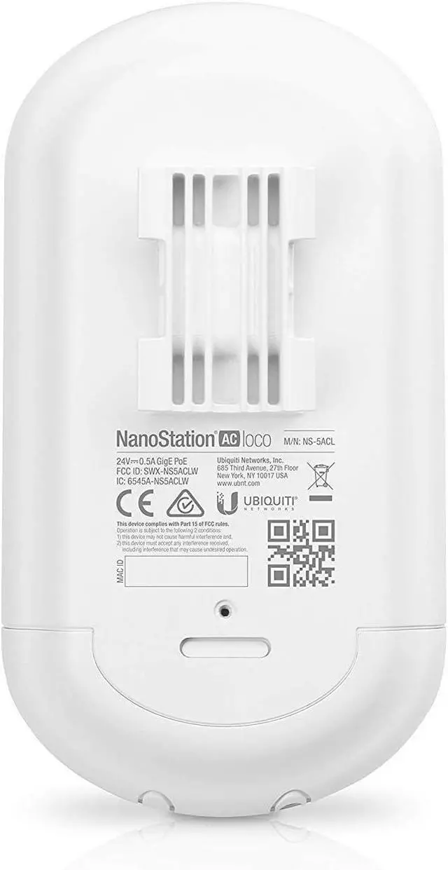 Model: NS-5ACL-US The Ubiquiti NanoStation AC loco integrates airMAX Wireless Access Point (MIMO TDMA protocol) technology and dedicated Wi-Fi management to create a more efficient and compact CPE. The low cost, high performance, and small form factor of the NanoStation AC loco makes it extremely versatile and economical to deploy. The NS-5ACL Integrate a separate Wi-Fi radio for fast and easy setup using your mobile device Sleek Industrial Design The NanoStation AC loco represent the next evolution of the iconic CPE design that revolutionized the Wireless ISP industry. Management Wi-Fi Radio Each NanoStation AC model integrates a separate Wi-Fi radio for fast and easy setup using your mobile device. Now with airOS 8 airOS 8 provides powerful features, including airMAX ac protocol support, real-time RF analytics, and an all-new design for enhanced usability.