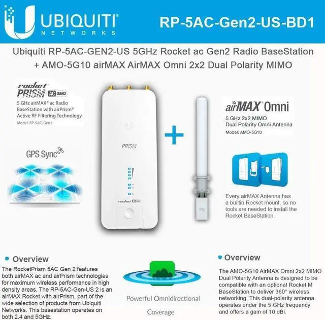 Ubiquiti Networks AirPrism BaseStation RP-5AC-GEN2-US 5GHz AC with 10dBi Omni Antenna (US Version)