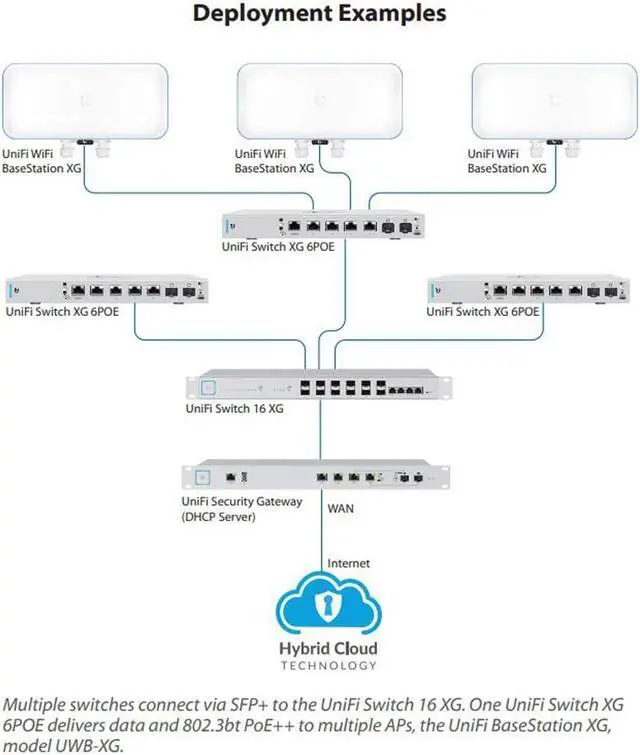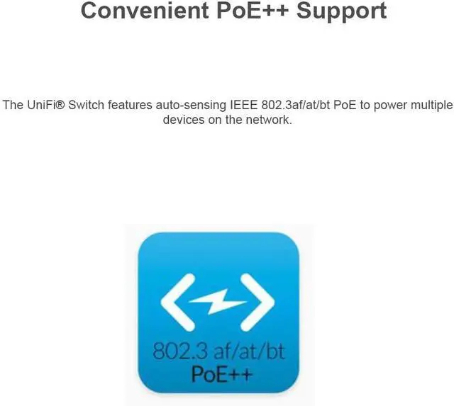 The UniFi Switch features auto-sensing IEEE 802.3af/at/bt PoE to power multiple devices on the network.
