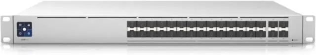 Build and expand your network with the UniFi ® Switch, part of the Ubiquiti Networks ® UniFi Enterprise System. The UniFi Switch, model USW-Aggregation-Pro, is a congurable 10G ber Layer-3 switch. It offers 28 10G SFP+ ber links to your devices and 4 25G SFP28 ber uplink options to your enterprise network. The USW-Aggregation-Pro features a 1.3" touch LCM. The LCM provides current switch states and the necessary information you need for quick diagnosis. Managed and congured by the UniFi Network Application with UniFi Network Mobile app support, the UniFi Switch offers an extensive suite of advanced Layer-3 switching protocols and features, including operation mode (switching, mirroring, or aggregate) per port, Inter-VLAN routing, static routing, and DHCP server. The UniFi Network Application and mobile app allow admins to congure and monitor virtually all of the switch features in a graphical user interface from anywhere. RPS DC inputis a new feature on USW-Aggregation-Pro, this DC input provides redundant power when the switch is connected to USP-RPS (UniFi Smart Power RPS) via RPS DC input. When the switch's internal PSU is off, the Switch function can keep working by backup power from the USP-RPS input port.