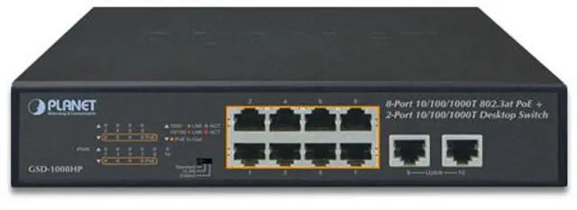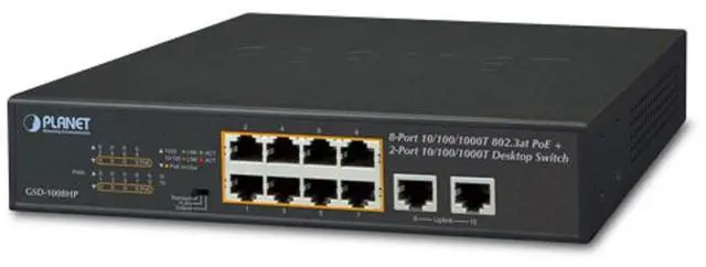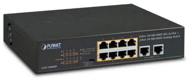 The GSD-1008HP provides 8 10/100/1000T ports featuring 30-watt (30W) 802.3at PoE+, a total 120-watt PoE budget and extra two uplink ports. This switch fulfills the demand of sufficient PoE power for HD IP surveillance and Wi-Fi systems in a small-scale but high-performance network. The desktop-sized and compact metal housed unit makes placement convenient and provides a quick and easy PoE PD deployment with power feeding.