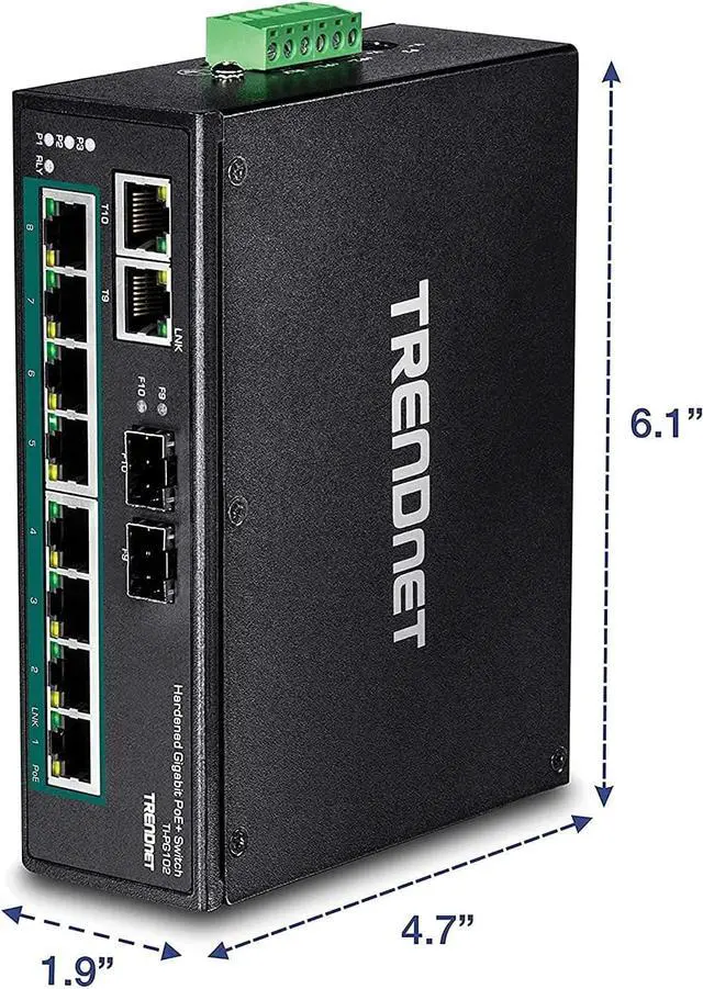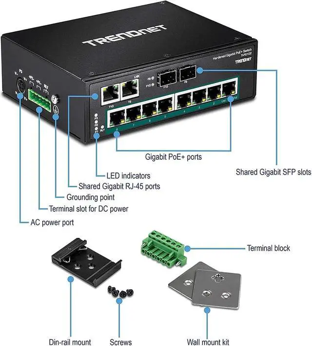DIN-RAIL & WALL MOUNT KIT: This 10-Port gigabit PoE+ industrial switch comes with an integrated DIN-Rail mount and mounting hardware
