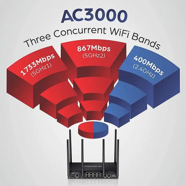 PERFORMANCE AC3000 TRI-BAND WiFi: Three concurrent WiFi bands maximize device networking speeds: two separate high performance 802. 11ac networks up to 1733Mbps (5GHz1) + 867Mbps (5GHz2) + 400Mbps (2. 4GHz) bands.