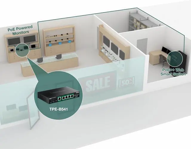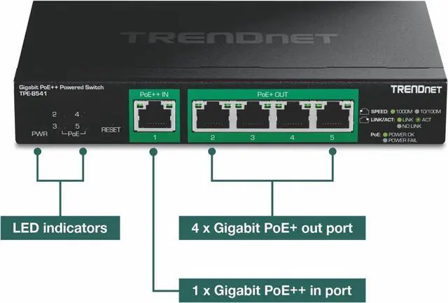 Next page TRENDnets 5-Port Gigabit PoE++ Powered Managed Switch with PoE Passthrough, model TPE-B541, is powered by a PoE++switch or injector, no AC adapter is required. The compact PoE++-powered managed switch features four gigabit PoE+ ports to powerdevices, such as IPcameras, VoIPhandsets, and wireless access points, with a 60W total PoE power budget. Reducing unnecessaryswitch complexity, this PoE++ passthrough managed switch is equipped with management features such as VLANs, QoS, PoEcontrol, and monitoring.