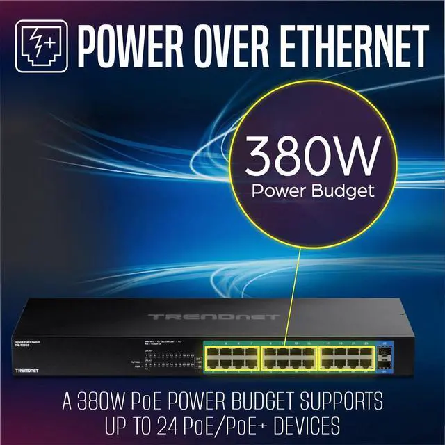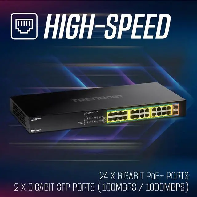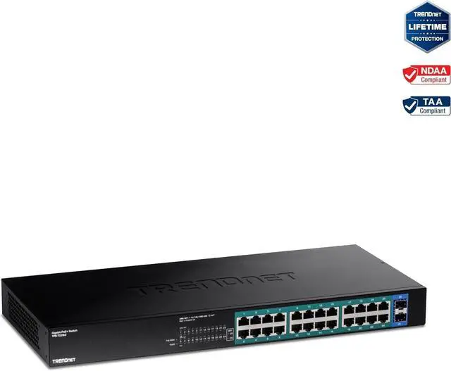Next pageThis ItemTRENDnet 26-Port Gigabit PoE+ Switch, TPE-TG262, 380W PoE Power Budget, 52Gbps Switching Capacity, Ethernet Splitter, NDAA & TAA Compliant, Lifetime ProtectionRecommendationsTRENDnet 16-Port Gigabit Desktop Switch, TEG-S17D, 16 x Gigabit RJ-45 Ports, 32Gbps Switching Capacity, Ethernet Splitter, NDAA & TAA Compliant, Internal Power Supply, Lifetime Protection, Black TRENDnet 12-Port 10G Layer 2 Managed SFP+ Switch, TL2-F7120, 12 x 10G SFP+ Ports, 240Gbps, Ethernet Splitter, NDAA & TAA Compliant, Lifetime Protection, Black TRENDnet 28-Port Gigabit Switch with 4 x 10G SFP+ Ports, TEG-30262, 24 x Gigabit Ports, 4 x 10G SFP+ Ports, 128Gbps, 1U Rack Mountable, NDAA TAA Compliant, Lifetime Protection, Black Netgear ProSafe Plus Switch, 16-Port Gigabit Ethernet | GS116E TP-Link TL-SG2428P - JetStream 28-Port Gigabit Smart Switch with 24-Port PoE+ - Limited Lifetime Protection
