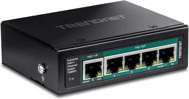 Next page TRENDnets 5-Port Industrial Gigabit PoE++ Powered DIN-Rail Switch with PoE Pass-Through, model TI-B541, is powered by a PoE++ switch or injector, no AC adapter is required. The PoE-powered industrial switch features four gigabit PoE+ ports to power devices such as IP cameras, VoIP handsets, and wireless access points. The switchs PoE++ powered feature allows it to be installed in a place where there is no power source nearby. With an operating temperature range of -40° 75 °C (-40° 167 °F), the hardened IP30 rated housing is suitable for extreme industrial environments.