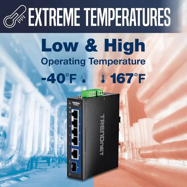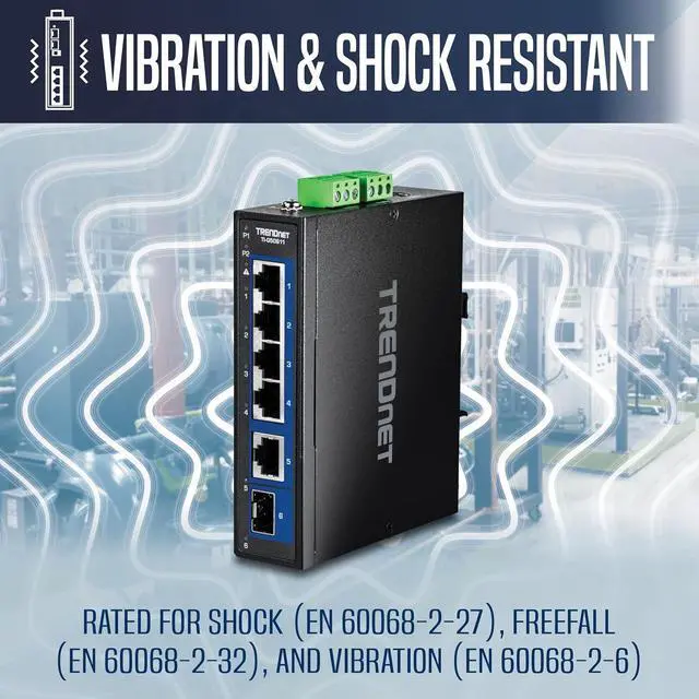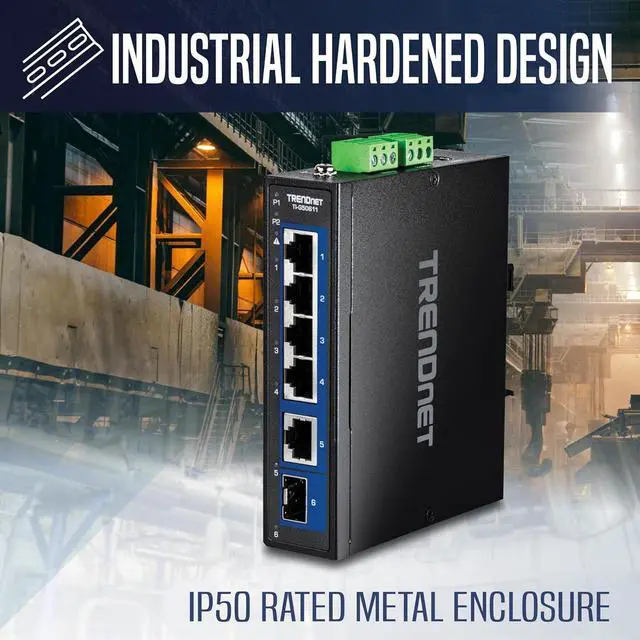 Next page TRENDnets 6-Port Industrial 2.5G DIN-Rail Switch with 1 x 10G Port , model TI-G50611, features a rugged IP50 rated metalenclosure and is designed to work in the harshest networking environments. This industrial multi-gigabit switch is designed towithstand a high degree of vibration and shock, while operating in both high and low temperatures for industrial environmentswithin -40° 75° C (-40° 167° F). Redundant power inputs with overload current protection, and a power failure alarm relayminimize network downtime. This multi-gig DIN-Rail network switch features 2.5G and 10G copper ports for high-speeddevice connections, and a 10G SFP+ port for backbone fiber networking applications.