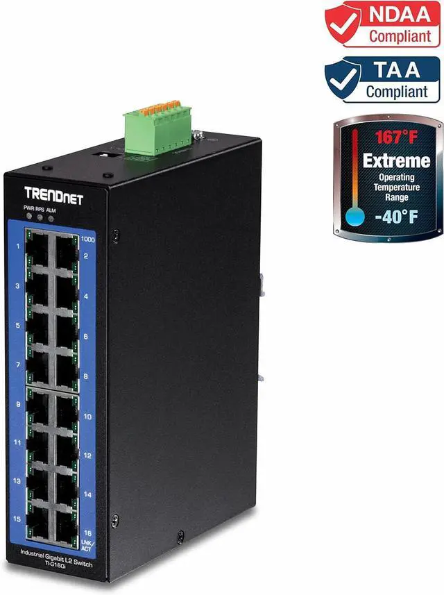 Equipped with an IP30 rated metal enclosure, the industrial layer 2 managed switch operates within a wide temperature range of -40° 75° C (-40° 167° F).