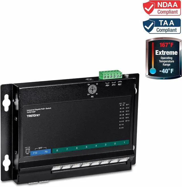 Next pageThis ItemTRENDnet 10-Port Industrial Gigabit PoE+ Wall-Mounted Front Access Switch, TI-PG102F, 8x Gigabit PoE+ Ports, 2 x Gigabit SFP Slots, 240W PoE Budget, DIN-Rail & Wall Mount Brackets Included, IP40 RatedRecommendationsTRENDnet 6-Port Hardened Industrial Gigabit PoE+ DIN-Rail Switch, 4 x Gigabit PoE+ Ports, Shared Gigabit Port (RJ-45/SFP), Dedicated SFP, 120W Power Budget, IP30, Lifetime Protection, Black, TI-PG62 LINOVISION Industrial 8-Port Full Gigabit POE++ Switch with 4 BT 90W PoE Ports, 2 Gigabit SFP Uplinks, POE Budget 120W, POE Watchdog, DIN-Rail POE Switch for PTZ Camera/POE Lighting/ POE Monitor TP-Link TL-SG1005P, 5 Port Gigabit PoE Switch, 4 PoE+ Ports @65W, Desktop, Plug & Play, Sturdy Metal w/ Shielded Ports, Fanless, QoS & IGMP Snooping,black Industrial 8-Port Full Gigabit POE+ Switch with Industrial DIN-Rail Power Supply, 2 Gigabit Uplink Port, Total 120W Budget, DIN-Rail POE Switch for IP Cameras, VoIP Phones, Wireless APs LINOVISION Industrial 5 Ports Gigabit Solar POE Switch with DC9V-54V to DC48V Voltage Booster,4 x IEEE802.3af/at 30W POE Ports @120W, IP40, Compact POE Power for Solar Power/RV Truck/VoIP Systems