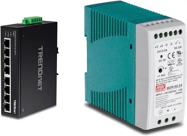 Trendnets 60 W Single output industrial DIN-Rail Power Supply, Model TI-M6024 (mean Well mdr-60-24), supplies up to 60 watts of power to industrial PoE equipment such as switches, network cameras, and Wi-Fi access points. This Power Supply comes with an integrated DIN-Rail mount and overload current protection.