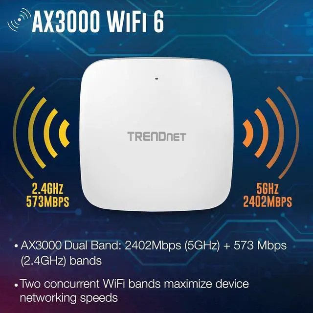 Next page TRENDnets high-performance AX3000 Dual Band WiFi 6 PoE+ Access Point, model TEW-923DAP, features two concurrent WiFi bands to maximize networking speeds with the latest WiFi 6 technology. The two separate high-speed WiFi 6 bands provide speeds up to 2402Mbps on the 5GHz band and 573Mbps on the 2.4GHz band. The access point also supports Access Point (AP) and Repeater modes. Faster speeds are possible on this WiFi 6 access point with 1024-QAM, OFDMA, and MU-MIMO technologies. MU-MIMO technology processes multiple data streams simultaneously, increasing real-time WiFi performance when multiple devices access the network. The wireless access point features access control, bandwidth control, and band steering. The low-profile housing design blends into most environments and includes a convenient wall / ceiling mounting plate.
