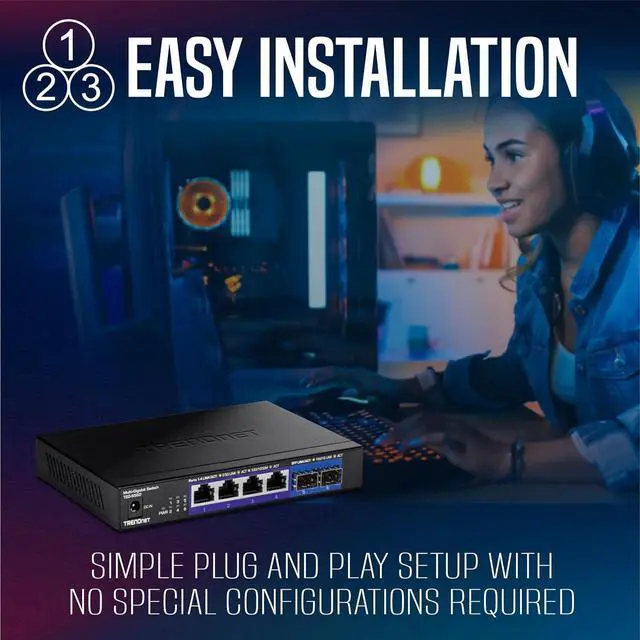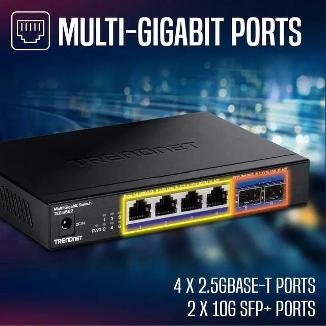 Next page Expand your networks bandwidth and reduce traffic bottlenecks with TRENDnets Unmanaged Multi-Gigabit Switches. This 2.5G switch with SFP+ support comes equipped with 2.5GBASE-T RJ-45 ports that provide higher gigabit speeds capable of up to 2.5Gbps over your existing Cat5e or better cabling. The 2.5G switch with 10G fiber also offers two dedicated 10G SFP+ ports for high-speed network connections, providing a cost-effective solution in adding 10G link capability to an SMB network. The fanless design lowers energy consumption and eliminates distracting operating noise. TRENDnets reliable multi-gigabit switches are cost-effective solutions to increase your networks throughput.