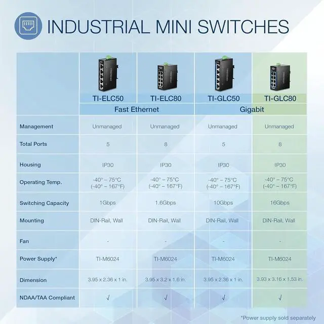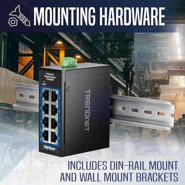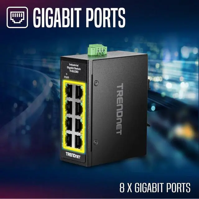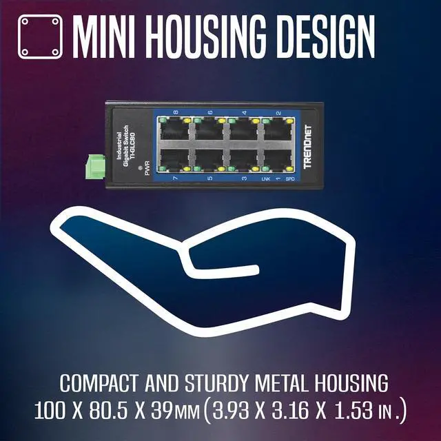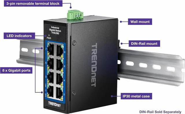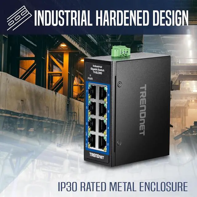 TRENDnets 8-Port Industrial Gigabit DIN-Rail Mini Switch, model TI-GLC80, is a reliable and rugged networking solution that is designed for use in both extreme and demanding environments. This compact industrial switch features a rugged IP30 rated metal enclosure, and is designed to withstand a high degree of vibration and shock, while operating in both high and low temperatures for industrial environments within -40° 75° C (-40° 167° F). The hardened industrial mini switch features eight copper Gigabit ports for high-speed device connections. The mini-sized housing is designed to fit into most compact installation areas.