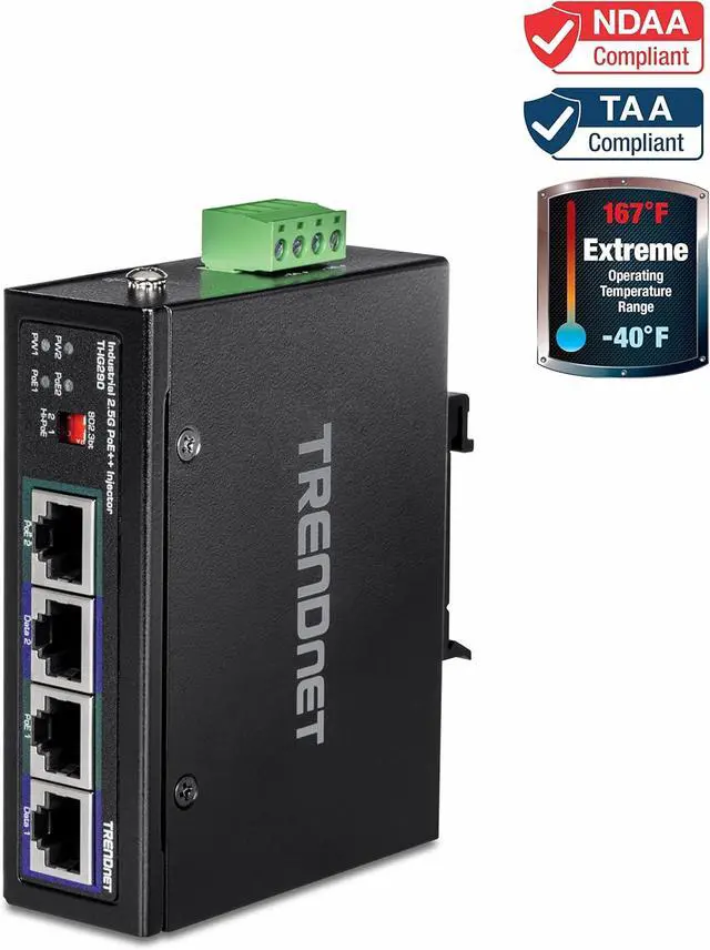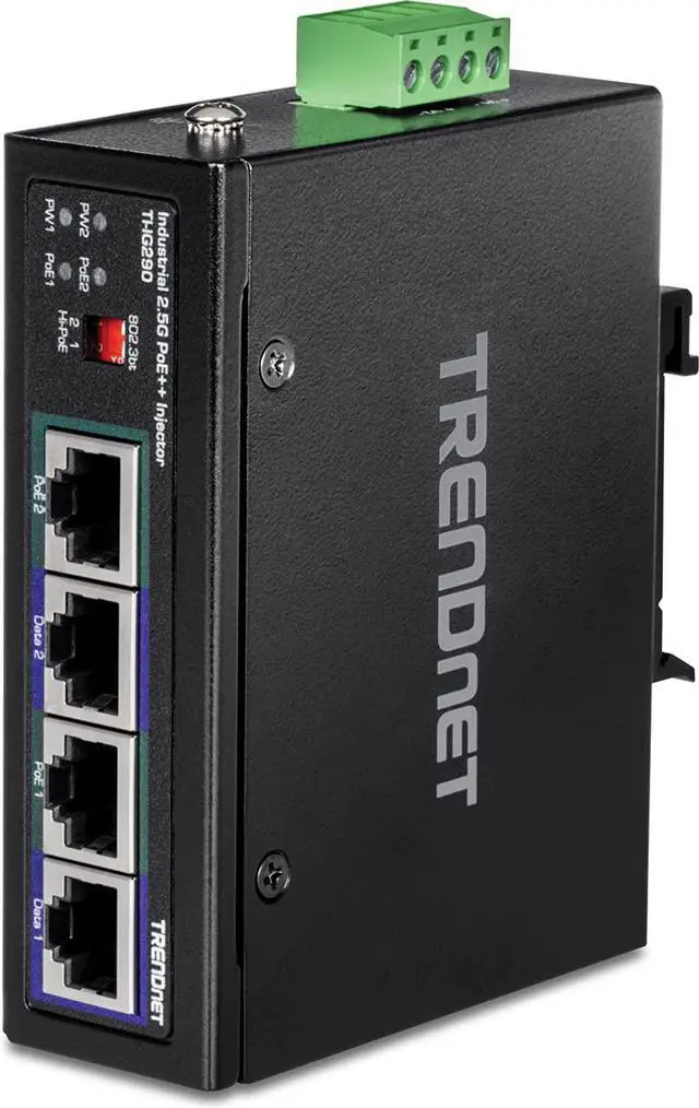 TRENDnets 95W 2-Port Industrial 2.5G PoE++ Injector, model TI-IG290, allows users to add PoE++ power to a non-PoE 2.5Gswitch. Connect the 2-port industrial 2.5G PoE++ injector to a non-PoE 2.5G switch, and then run Ethernet cables up to 100 meters(328 ft.) to network two PoE/PoE++ devices. This multi-port industrial 2.5G PoE++ injector supplies up to 95W of power to two PoEdevices with a total PoE budget of 180W. The fanless design conveniently eliminates operating noise and lowers unnecessaryenergy consumption. The dual port industrial 2.5G PoE++ injector is equipped with an IP30 rated metal enclosure, designed towithstand a high degree of vibration and shock, while operating within a wide temperature range of -40 to 75 °C (-40 to 167 °F) for harsh industrial environments.