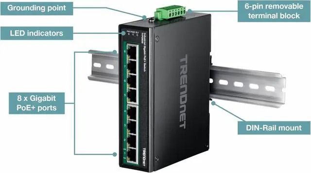 DEVICE INTERFACE: 8 x Gigabit PoE+ Ports; 6-Pin Removable Terminal Block; LED Indicators; DIN-Rail Mount; Wall Mount; Grounding Point