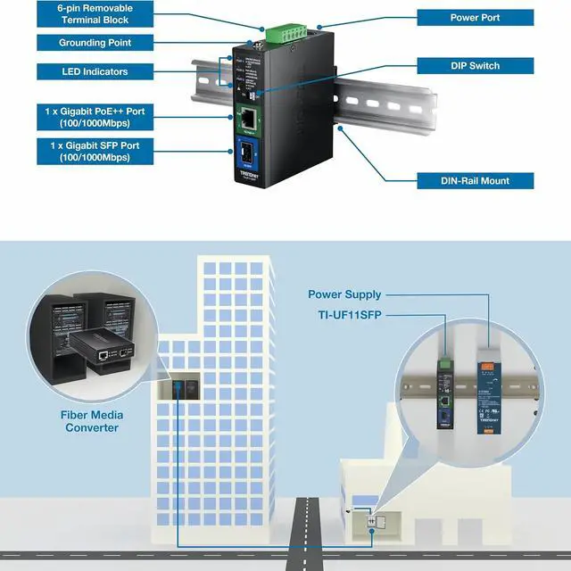 PoE++ OUTPUT: Converts long-distance fiber to copper while providing up to 95W of power to PoE, PoE+ and PoE++ compliant devices, such as IP cameras and wireless APs.