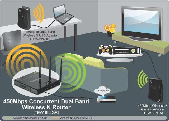 Concurrent Dual Band technology generates two separate 450 Mbps wireless n networks at the same time