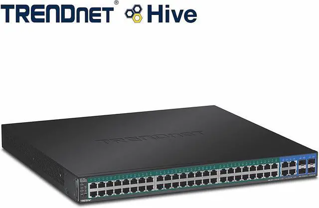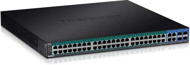 TRENDnets 52-Port Gigabit Web Smart PoE+ Switch, model TPE-5048WS, delivers advanced management features with a 104Gbps switching capacity. This rack mountable IPv6 ready switch comes with an intuitive web-based interface. Advanced traffic management controls, troubleshooting, and SNMP monitoring make this a powerful solution for SMB networks. The TPE-5048WS provides 48 gigabit PoE+ ports with a total power budget of 740W, and four shared gigabit ports (RJ-45 or SFP). The PoE+ standard supplies up to 30W of power per port for devices such as high power wireless access points, PTZ (Pan Tilt Zoom) Internet cameras, and VoIP telephony systems.