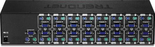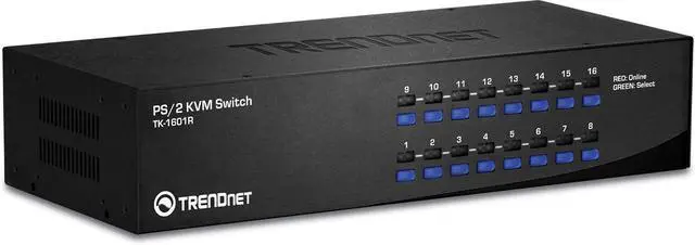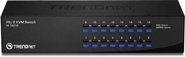 Trendnet TK-1601R 16-port KVM Rack Mount Switch, 16-Port KVM Switch allows you to manage up to 16 PC´s with just one keyboard, monitor, and mouse. Supports Microsoft IntelliMouse, IntelliMouse Explorer, Logitech NetMouse, Optical Mouse and more ,switch between multiple PC´s with a simple press of a button Eliminate the hassle of cable swapping and save money and space with TK-1601R. With its rack-mount kit and slim two unit height, it is perfect for mounting on EIA-19¿ rack in the Equipment Room and Computer Lab. With its Hot-Plug, Auto-Scan, Audible Feedback, and Hot-Key operations, the TK1601R is the perfect choice for managing multiple PCs.