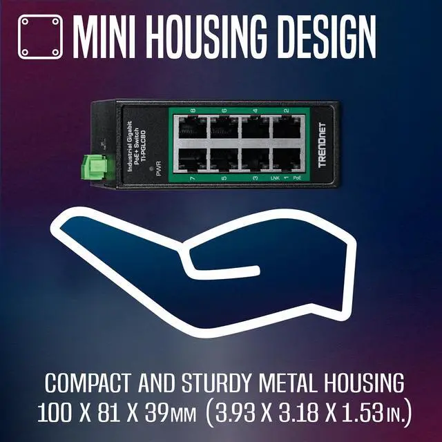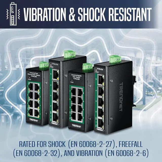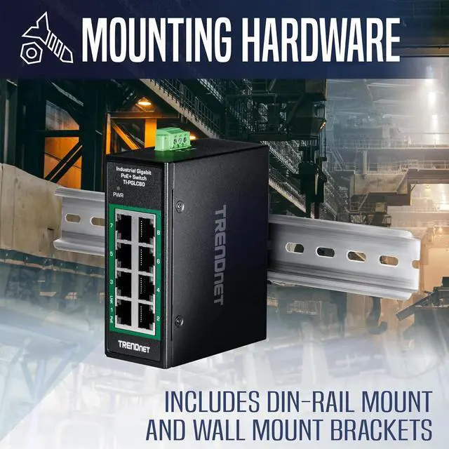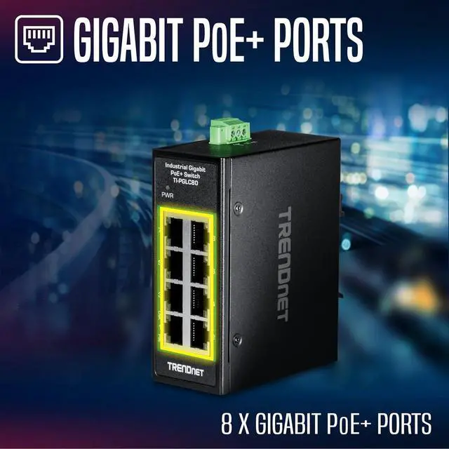 TRENDnets 8-Port Industrial Gigabit PoE+ DIN-Rail Mini Switch, model TI-PGLC80, is a reliable and rugged networking solution designed for use in both extreme and demanding environments. This Industrial Gigabit DIN-Rail Mini Switch features a rugged IP30 rated metal enclosure, and is designed to withstand a high degree of vibration and shock, while operating in both high and low temperatures for industrial environments within -40° 75° C (-40° 167° F). The hardened industrial switch features eight copper gigabit PoE+ ports for high-speed device connections. The mini-sized housing is designed to fit into most compact installation areas. Installers and integrators can save on equipment costs and reduce installation time with TRENDnets Industrial Gigabit PoE+ Switches by delivering up to 30W per port of PoE power and data over existing Ethernet cables. With PoE technology, users only need one cable to deliver both data and power from the industrial unmanaged PoE+ switch. With these industrial unmanaged PoE+ switches, easily network PoE devices, such as high-power wireless access points, PTZ and other advanced IP cameras, VoIP phone systems, IPTV decoders, access controls, and more.
