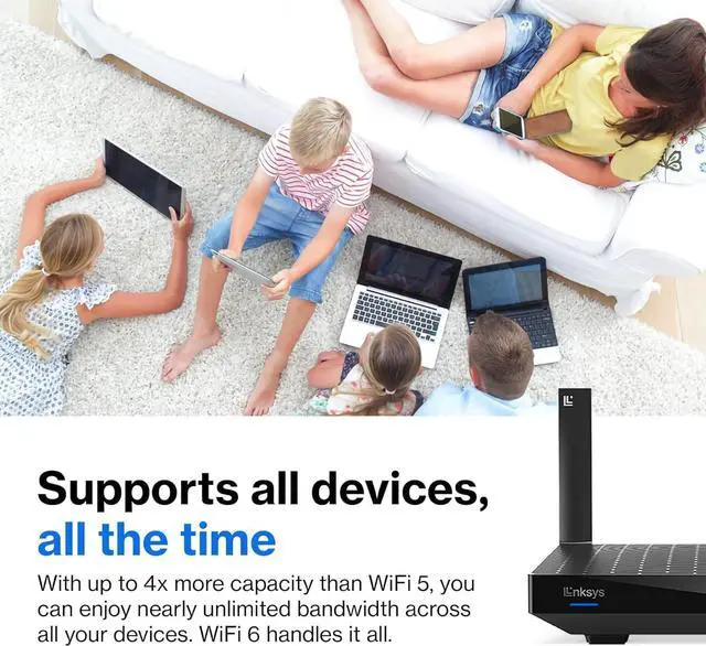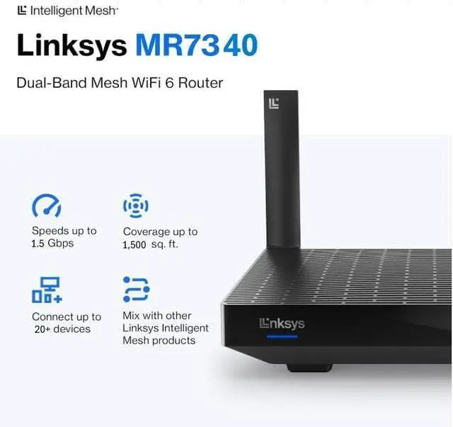 Experience Mesh Wi-Fi that lets you stream, game and binge nonstop with the Linksys MR7340 Dual-Band Wi-Fi 6 Router. The MR7340 covers up to 1500 square feet and handles up to 20+ devices at speeds up to 1.5 Gbps. Powered by Intelligent Mesh Technology that was built from the ground up, your devices will always be on the fastest path to the internet. If your needs change and you want to grow your network, this future-ready router expands by adding any Linksys Mesh compatible products. Setup is easy using the Linksys App and youll be streaming and ready to binge in minutes.With Alexa, you can easily manage Wi-Fi access for devices and individuals in the home, taking focus away from screens and back to whats important. Say commands like Alexa, turn off Timmys Wi-Fi, when its time for dinner or Alexa, enable guest Wi-Fi when you have people over.