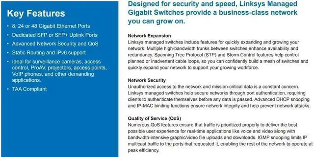 ADVANCED NETWORK SECURITY - Ensure data passes to authorized clients only with port authentication. Advanced DHCP snooping and IP-MAC binding functions assure network integrity and help prevent attacks.