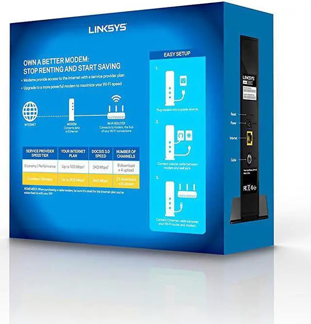 Cable Modem only (no WiFi router), Interfaces: Cable: F type female 75 ohm