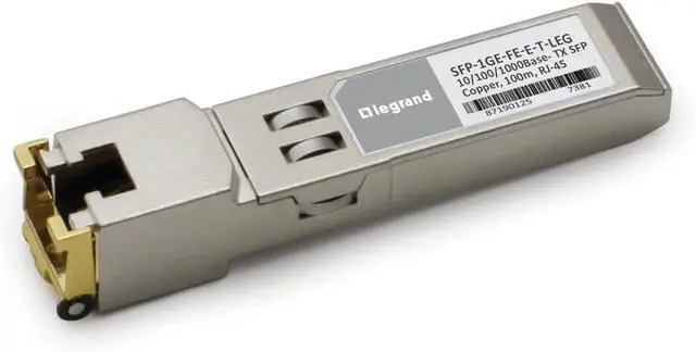 Legrands SFP-1GE-FE-E-T-LEG, Copper Small Form Pluggable (SFP) transceiver is a high performance, cost effective module compliant with the Gigabit Ethernet and 1000- BASE-T standards as specified in IEEE 802. 3-2002 and IEEE 802.3ab, which supporting 1000Mbps data- rate up to 100 meters reach over unshielded twisted-pair CAT 5 cable. The module supports 1000 Mbps (or 10/100/1000Mbps) full duplex data-links with 5-level Pulse Amplitude Modulation (PAM) signals. All four pairs in the cable are used with symbol rate at 250Mbps on each pair. The module provides standard serial ID information compliant with SFP MSA, which can be accessed with address of A0h via the 2wire serial CMOS EEPROM protocol. The physical IC can also be accessed via 2wire serial bus at address ACh.