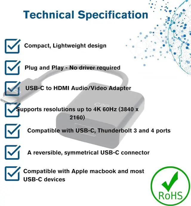Supports resolutions up to 4K (3840 x 2160) at 60Hz Compatible with USB-C, Thunderbolt 3 and Thunderbolt 4 ports A reversible, symmetrical USB-C connector Compact, lightweight designSpecifications Jacket Material: PVC (Polyvinyl Chloride)