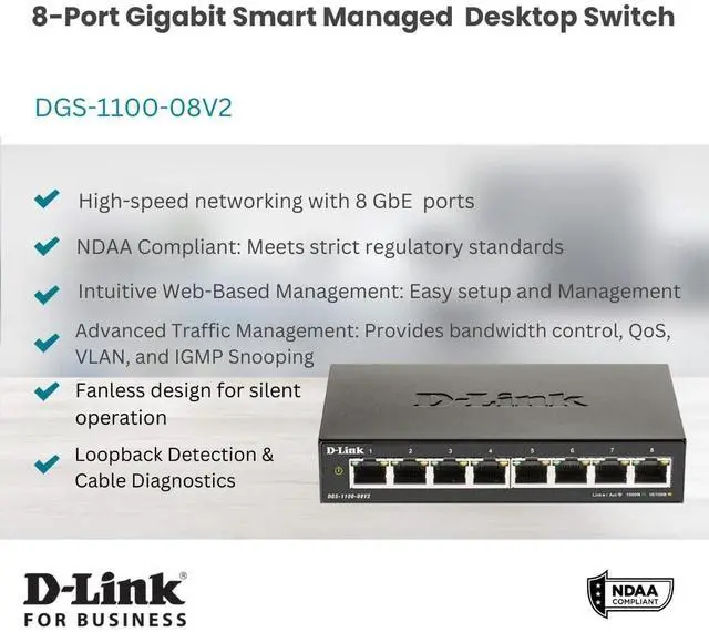 GIGABIT SMART MANAGED PERFORMANCE ON A BUDGET: With 8 x 10/100/1000BASE-T Gigabit Ports packed in a compact design, the DGS-1100-08V2 is a great choice for any business looking for a managed Gigabit switch on a tight budget