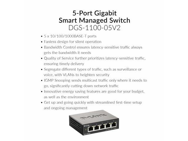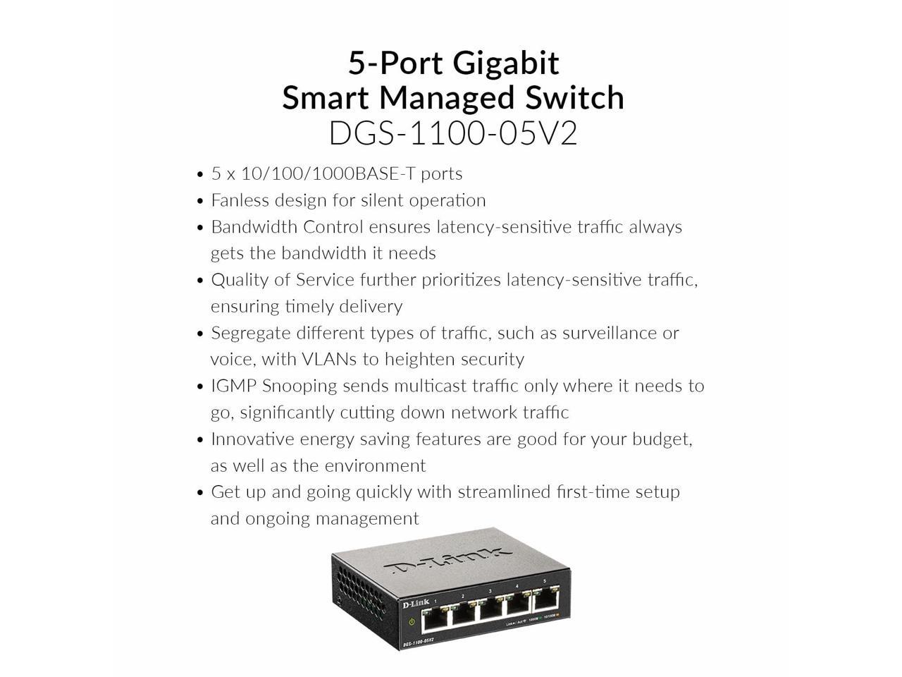 - GIGABIT SMART MANAGED PERFORMANCE ON A BUDGET: With 5 x 10/100/1000BASE-T Gigabit Ports packed in a compact design, the DGS-1100-05V2 is a great choice for any business looking for a managed Gigabit switch on a tight budget