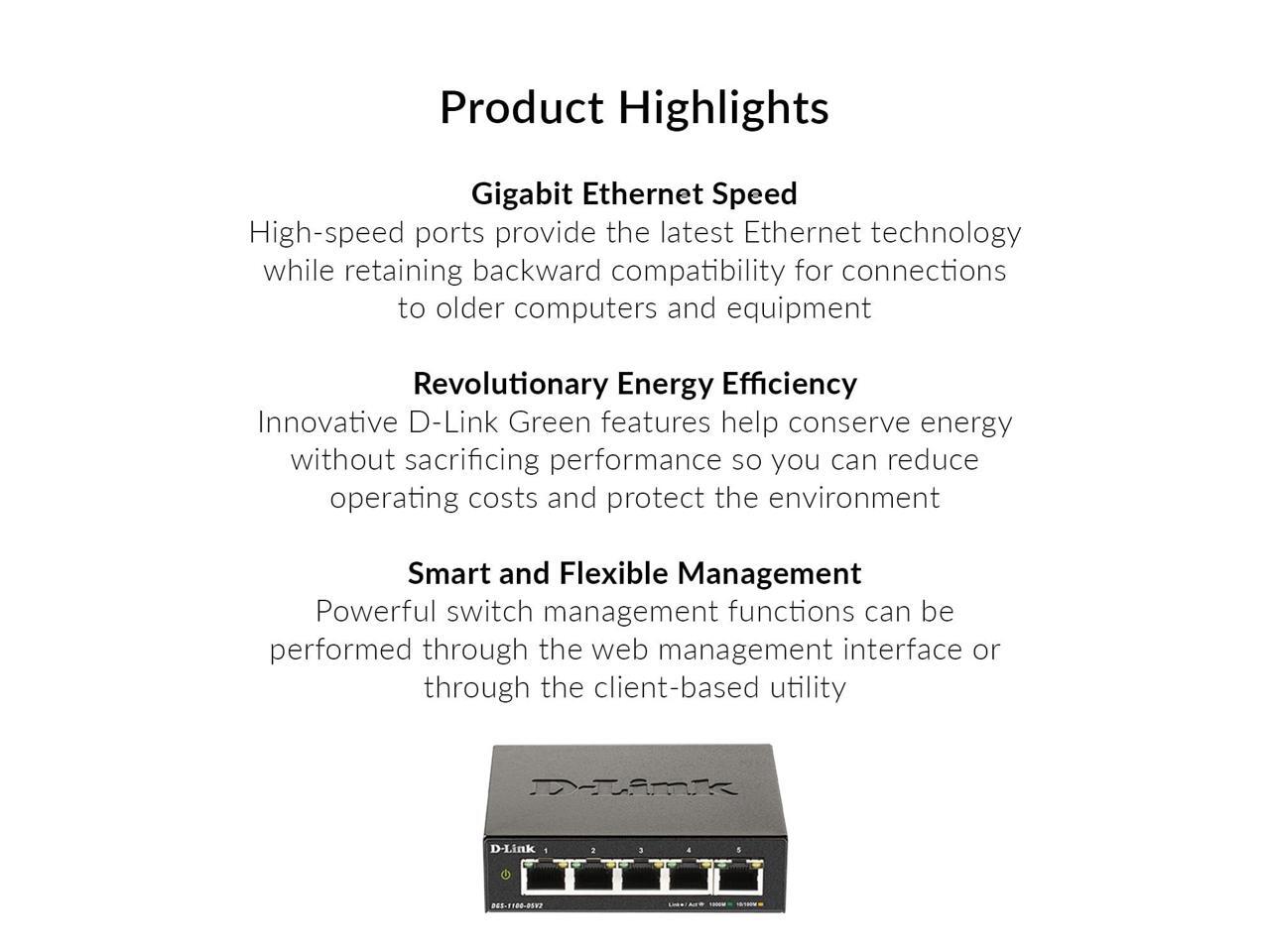 - INNOVATIVE & ENERGY-SAVING: Utilizing a fanless design, the DGS-1100-05V2, ensures a longer product life, as well offering silent and energy-efficient operation. It is also IEEE 802.3az-compliant and offers Link Status detection