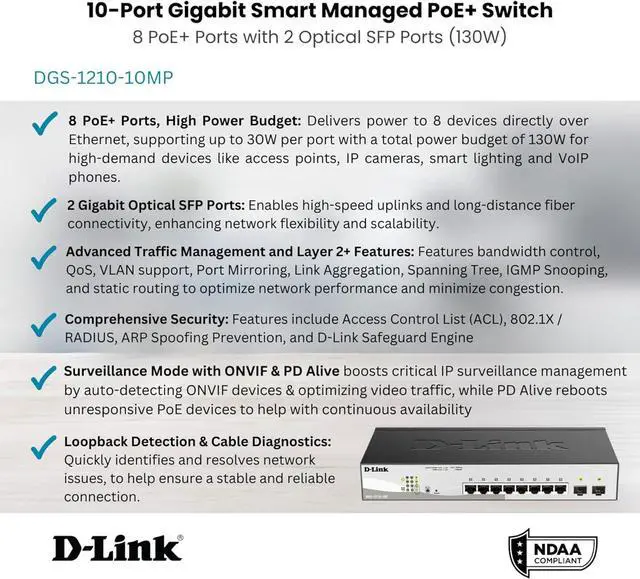 8 POE+ GIGABIT PORTS FOR HIGH-SPEED NETWORKING: Delivers power to 8 devices directly over Ethernet, supporting up to 30W per port with a total power budget of 130W for high-demand devices like access points, IP cameras, and VoIP phones