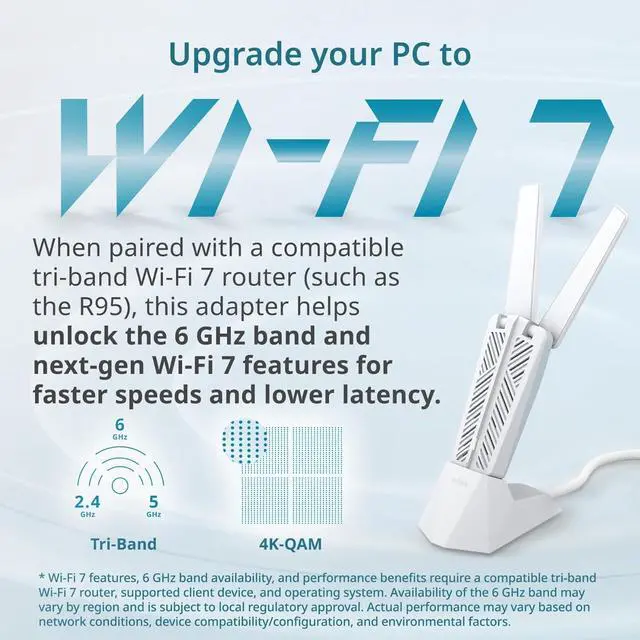 UPGRADE YOUR PC TO Wi-Fi 7: When paired with a compatible tri-band Wi-Fi 7 router, this adapter helps unlock the 6 GHz band and next-gen Wi-Fi 7 features, including wider channels, and advanced modulation, for faster speeds and lower latency