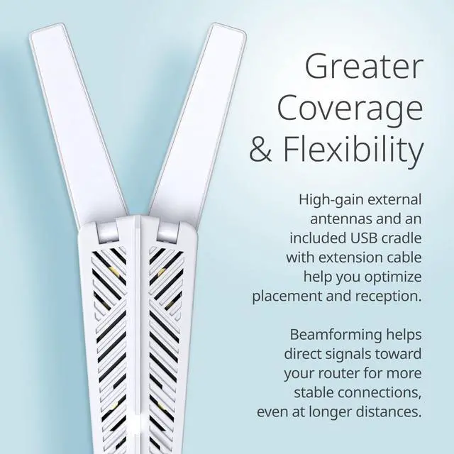 GREATER COVERAGE & FLEXIBILITY: High-gain external antennas and an included USB cradle with extension cable help you optimize placement and reception. Beamforming helps direct signals toward your router for more stable connections, even at longer distances