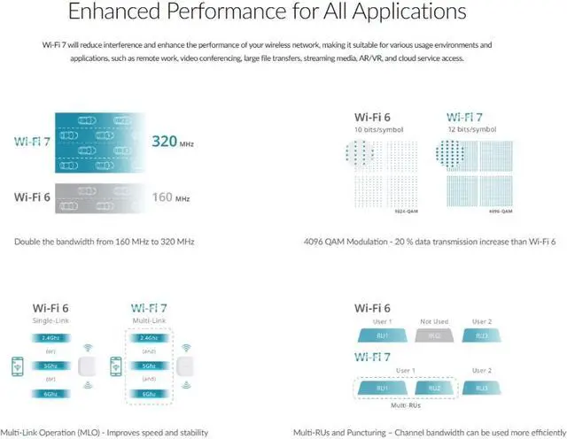 More Efficient - Wi-Fi 7 technology improves latency for real-time applications, enhances network reliability, and delivers significantly higher throughput, 4096-QAM significantly increases data transmission and capacity up to 20% more than Wi-Fi 6