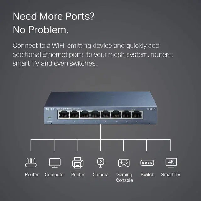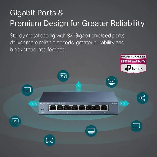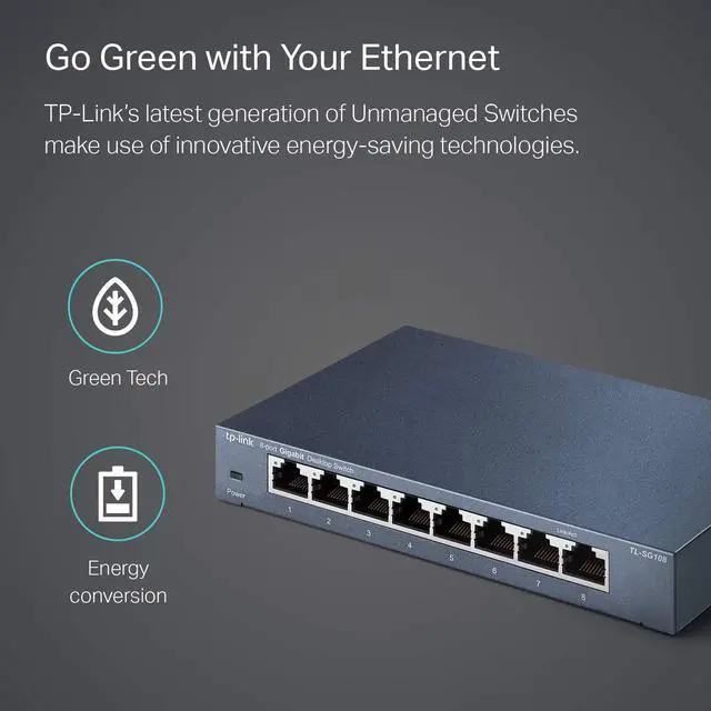 Details: What This Product Does TP-LINK’s TL-SG108 provides an easy way to expand your wired network. All 8 ports support Auto-MDI/MDIX eliminating the need to worry about what type of cable to use. Featuring full duplex mode the device can process data at a rate of up to 2000Mbps making it an ideal choice for expanding your high performance wired network. Moreover with innovative energy-efficient technology the TL-SG108 can save energy up to 72%. Key Features Gigabit Switch Featured with 8 10/100/1000Mbps ports the TL-SG108 enables ultra-fast wired connectivity enabling instant large files transferring. Steel Housing The TL-SG108 is housed in a compact steel case for longer life span. With the desktop or wall-mounting design you can place the device wherever it’s convenient. Easy to Use The auto features of this gigabit switch make installation plug and play and hassle-free. No configuring is required. Auto MDI/MDIX eliminate the need for crossover cables. Auto-negotiation on each port senses the link speed of a network Go Green with Your Ethernet The TL-SG108 features the latest innovative energy-efficient technologies that can save power up to 72%. It automatically adjusts power consumption according to the link status and cable length to limit the carbon footprint of your network.