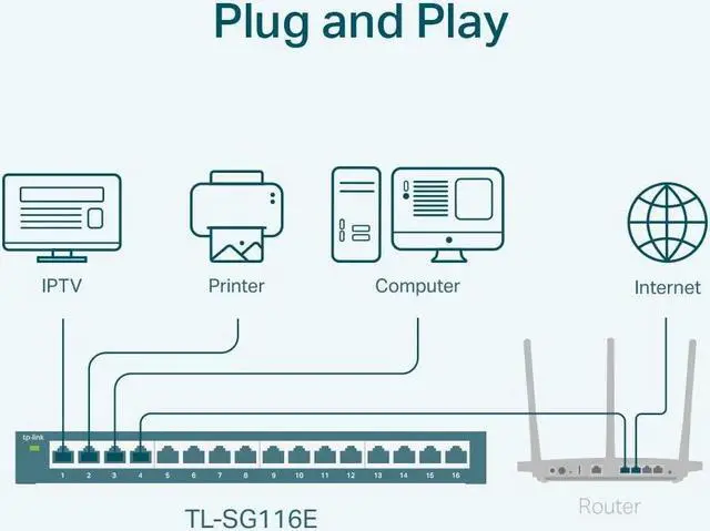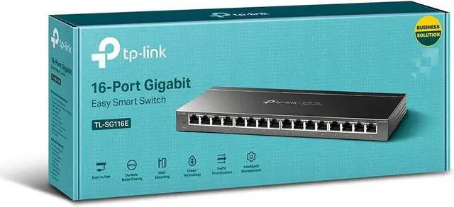 The TL-SG116E unmanaged Pro switch is an ideal upgrade on unmanaged switches, suited for home and small business networks. A plug-and-play design makes for easy deployment without the need for a technician, while a robust metal casing provides better protection for components. Equipped with intelligent management features like QoS, VLAN, IGMP Snooping and more, this switch is effective in both simple and more demanding network environments.