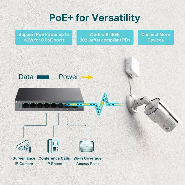 - - 8 PoEplus (802.3at/af) Gigabit RJ45 providing up to 30W per port and total PoE power budget of 65W. Up to 16 Gbps switching capacity.