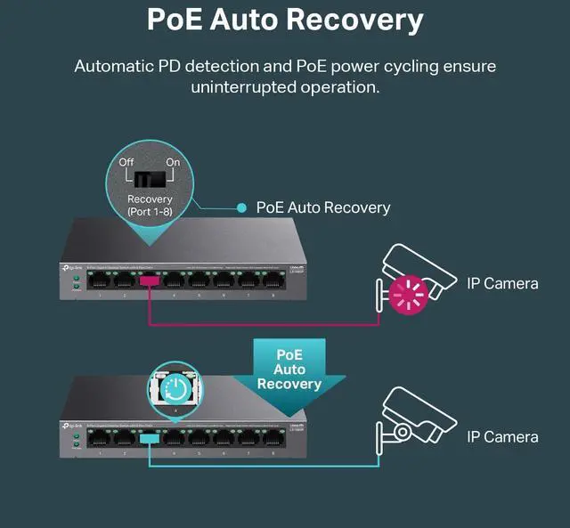 - Automatically reboots your dropped or unresponsive PoE-powered devices with PoE Auto Recovery Mode on.