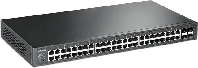 TP-LINK JetStream Gigabit Smart Switch T1600G-52TS is a cost-effective product solution for small and medium-sized business which provides high performance, powerful L2 and L2+ features like static routing, enterprise-level QoS and useful security strategies. Equipped with 48 gigabit RJ45 ports and 4 SFP slots, T1600G-52TS supports multiple useful features. Static Routing helps route internal traffic for more efficient use of network resources. The Storm Control feature protects against Broadcast, Multicast and Unknown unicast Storm. Quality of Service (QoS, L2 to L4) provides enhanced traffic management capabilities to move your data smoother and faster. Moreover, the easy-to-use web management interfaces, along with SNMP, RMON and Dual Image, mean faster setup and configuration with less downtime. For workgroup and departments requiring cost-sensitive L2/L2+ switch and gigabit capability, TP-LINK JetStream Gigabit Smart Switch T1600G-52TS provides you the ideal access-edge solution. Interface Available: 24 x 10/100/1000Mbps RJ45 Ports, (Auto Negotiation/Auto MDI/MDIX), 4 x 1000Mbps SFP Slots, 1 x RJ45 Console Port, 1 x Micro-USB Console Port; Protocols Supported: IEEE 802.3i IEEE 802.3u IEEE 802.3ab IEEE802.3z , IEEE 802.3ad IEEE 802.3x IEEE 802.1d IEEE 802.1s , IEEE 802.1w IEEE 802.1q IEEE 802.1x IEEE 802.1p; System Requirement: Microsoft Windows 98SE NT 2000 XP Vista, or Windows 7/8 MAC OS NetWare UNIX or Linux.