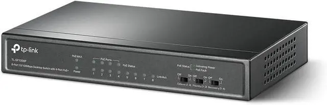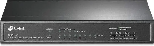 The TP-Link 8-Port 10/100Mbps Desktop Switch with 4-Port PoE is an 8 10/100Mbps ports unmanaged switch that requires no configuration and provides 4 PoE (Power over Ethernet) ports. It can automatically detect and supply power with all IEEE 802.3af-compliant Powered Devices (PDs). In this situation, the electrical power is transmitted along with data in one single cable allowing you to expand your network to where there are no power lines or outlets, where you wish to fix devices such as APs, IP cameras or IP phones, etc. Interface Available: 8 x 10/100Mbps RJ45 Ports, AUTO Negotiation/AUTO MDI/MDIX