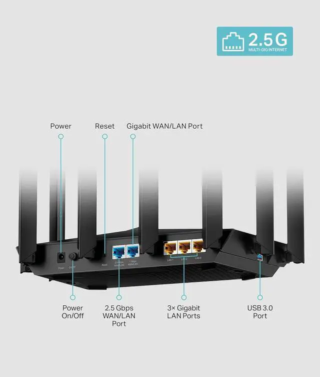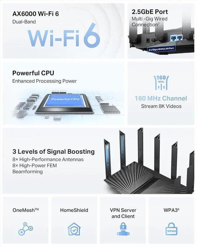 Archer AX80 covers your entire home with lightning-fast Wi-Fi and offers the option to expand with OneMesh. It uses powerful dual-band AX6000 Wi-Fi 6 technology delivering up to 4804 Mbps on 5.0 Ghz and 1148 Mbps on 2.4 Ghz band. This performance is further enhanced with latency and throughput improving technology such as MU-MIMO and OFDMA. The 2.5 Gbps ethernet port takes your internet to the next level. With more ISPs supporting multi-gig connection, Archer AX80 will break through the boundaries of single gig bottleneck.