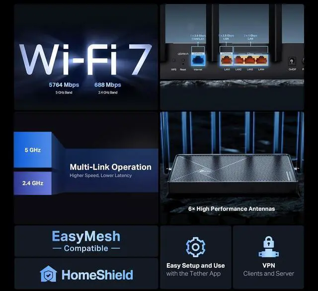 Future-proof your home with the Archer BE400, a Wi-Fi 7 BE6500 router that delivers fast, reliable coverage throughout your home. It is built with cutting-edge Wi-Fi 7 technology, featuring Multi-Link Operating (MLO), Multi-RUs, and 4K-QAM, ensuring exceptional speed and reliability for both wired and wireless internet connections. Whether youre streaming Netflix, Prime Video, or Disney+, or browsing at ultra-fast speeds on your Wi-Fi 7 devices, like the iPhone 16 Pro, the Google Pixel 9, or PS5 Pro, this router delivers top-tier performance. Increase the security of your home network by setting up a separate WiFi SSID for IoT devices, using the included HomeShield feature in the Tether app and advanced WPA3 encryption. This reduces the risk of unauthorized access to sensitive data or devices.
