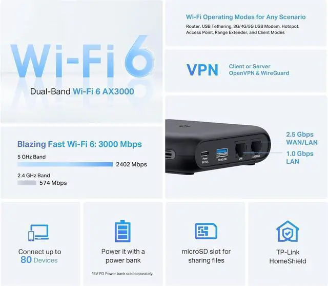 The compact and powerful TL-WR3002X Travel Router lets you create a personal, secure Wi-Fi network anywhere. With Wi-Fi 6 technology, you can enjoy more capacity for connected devices and faster wireless speed. TL-WR3002Xprovides encryption and authentication with OpenVPN & WireGuard. Our travel router offers versatile network modes to adapt to any scenario, including acting as a repeater for public Wi-Fi. Whether you're traveling for work or leisure, attending conferences, or joining virtual meetings on Zoom or Microsoft Teams, our portable wifi router has got you covered.