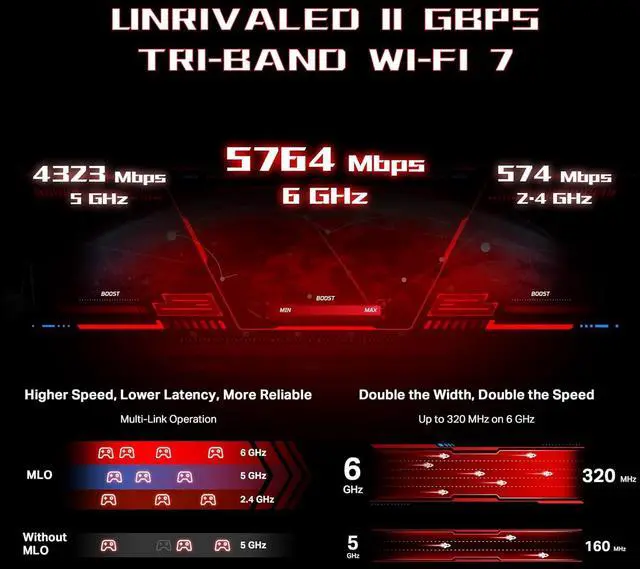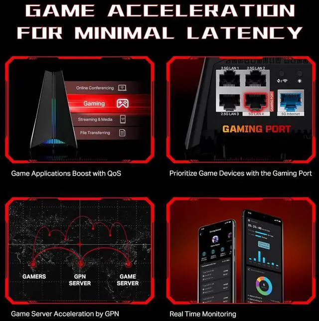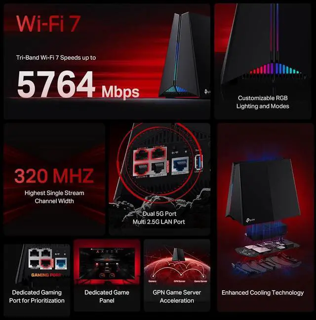 Archer GE650, a tri-band Wi-Fi 7 gaming router, offers speeds exceeding 10 Gbps, powered by a 1.5 GHz quad-core CPU and cutting-edge Wi-Fi chipset. With 2× 5G WAN/LAN ports, its perfect for multi-Gig entertainment such as low-latency gaming, 4K/8K streaming, AR/VR experiences, and home NAS setups. Its game acceleration enhances gaming traffic and stabilizes connections, reducing jitter and lag while lowering ping and boosting speed, ensuring incredible gaming experiences.