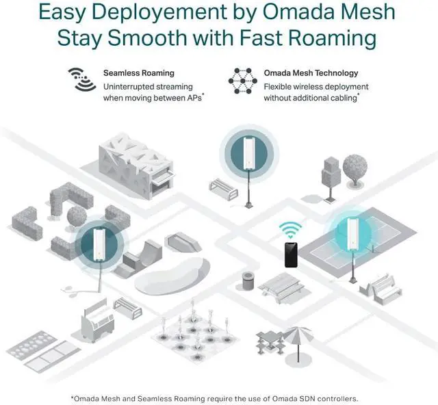 : Supports Mesh WiFi, Seamless Roaming*(Omada Mesh Seamless Roaming require the use of Omada SDN controllers), Band Steering, Load Balancing, Airtime Fairness and Beamforming technologies