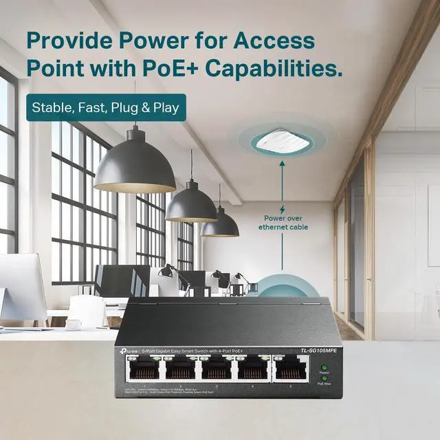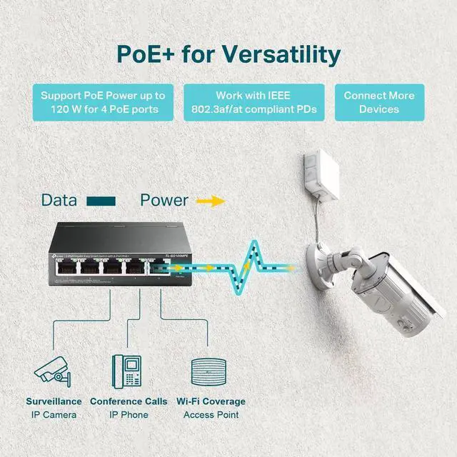 • : 4x PoEplus (802.3at/af) 10/100/1000 Mbps RJ45 ports providing up to 30W per port and total PoE power budget of 120W, together w/ 1x Gigabit Non-PoE Ports for high-speed connections.