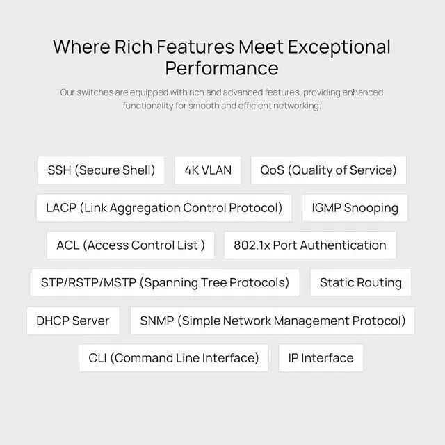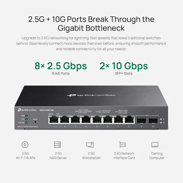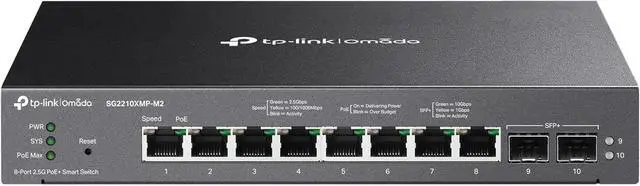 The Omada switch delivers powerful, high-speed connectivity with 8× 2.5 Gbps 802.3at/af-compliant PoE+ ports and 2× 10G SFP+ uplink slots, providing versatile expansion for demanding networks. With a 160 W total PoE budget and up to 30 W per port, it reliably powers access points, cameras, and IoT devices. Enjoy effortless control through centralized cloud management via the Omada web interface or mobile app, while still supporting standalone management for flexible deployment. Advanced features like Static Routing improve network efficiency, and the fanless design ensures silent operation for noise-sensitive environments. Designed for convenience and adaptability, it supports both desktop and wall-mounting installations